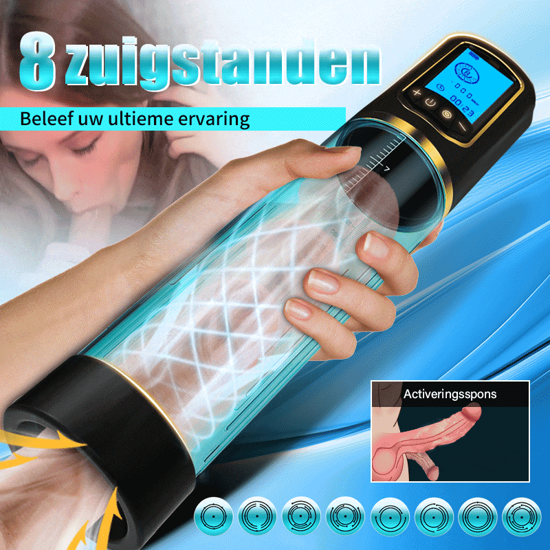 Dankzij de transparante ABS-cilinder kunt u zien hoe uw gereedschap wordt gekalmeerd, opgeblazen en bevredigd door de automatische vacuümzuiging. Door uw penis regelmatig te trainen met 8 krachtige zuigpatronen, zult u beseffen hoe sterk uw penis is!